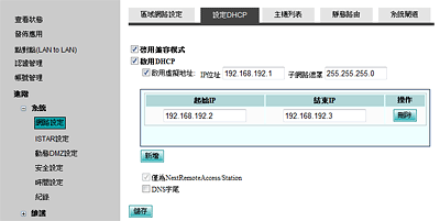 請進入到管理介面後,到「進階>>系統>>網路設定>>設定DHCP」的地方按一下「儲存」就可。